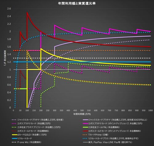 クレジットカードの年間利用額と還元率を徹底比較しました。年会費も加味してグラフ化しています。ここでは特定の加盟店(三井住友カードのコンビニなど)や支払い方法限定(セゾンパールアメックスのQUICPayなど)の還元率を考慮していませんので悪しからず。 ★…