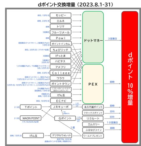 2023年夏に「dポイントに交換で10%増量キャンペーン」がやってきます!! 期間 エントリー&公式サイト 交換ルートを攻略 増量分のポイント 期間 ・エントリー:2023年7月4日(火)~2023年8月31日(木) ・交換:2023年8月1日(火)~2023年8月31日(木) ※ポイント…